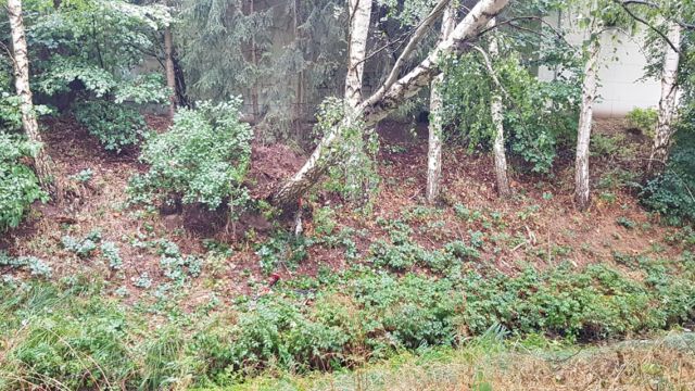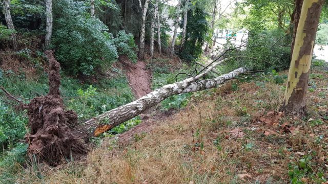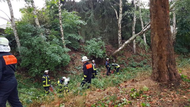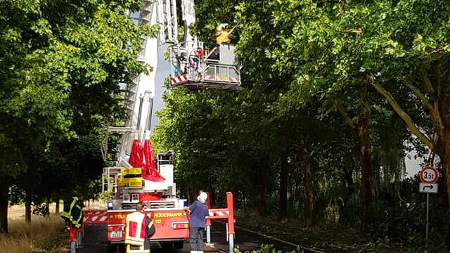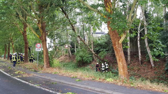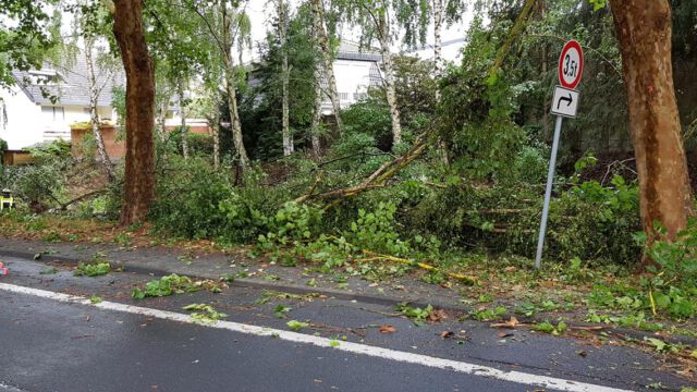 Durch den Wind wurde ein Baum entwurzelt. Dieser verkeilte sich in einem anderen. Der über die Straße hängende Baum wurde mittels des Teleskopmastes entfernt und die Fahrbahn anschließend gereinigt.
