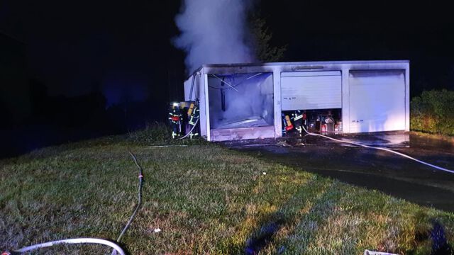 Ein zunächst als unklare Rauchentwicklung alarmierter Einsatz wurde bereits auf der Anfahrt durch mehrere Anrufer als ein Feuer bestätigt, sodass eine Stichworterhöhung auf F2 veranlasst wurde. Bei Eintreffen der Feuerwehr stand eine Garage im Vollbrand. Diese wurde mit 2 C-Rohren und einem Schaumrohr durch die Feuerwehr abgelöscht.